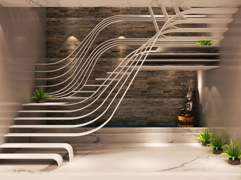 One of the most striking features of Sharma’s Residence is the grand staircase, a sculptural masterpiece that adds an undeniable wow factor to the interiors. Designed to be more than just a functional transition between floors, this staircase acts as an architectural centerpiece, embodying luxury and modern artistry. Featuring sleek metal railings with intricate detailing, the design is a perfect fusion of elegance and contemporary edge. The floating steps, finished in polished marble, enhance the sense of openness, making the space feel airy and grand. Soft recessed LED lighting highlights every step, giving the staircase a glowing, almost ethereal effect, especially in the evenings. Whether admired from the ground floor or as part of the open-concept upper level, this staircase is a bold statement of sophistication, seamlessly tying together the home’s modern aesthetics with timeless craftsmanship.